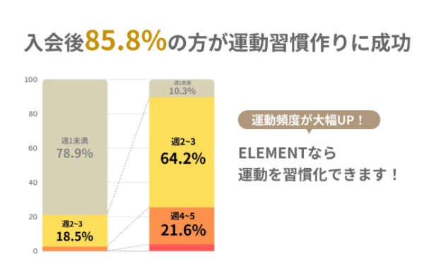 その点、ELEMENT(エレメント)は、定額制の通い放題プランで1回あたり約2,750円(1か月間で20回通った場合)なので、リーズナブルな料金でパーソナルを受けることができます。